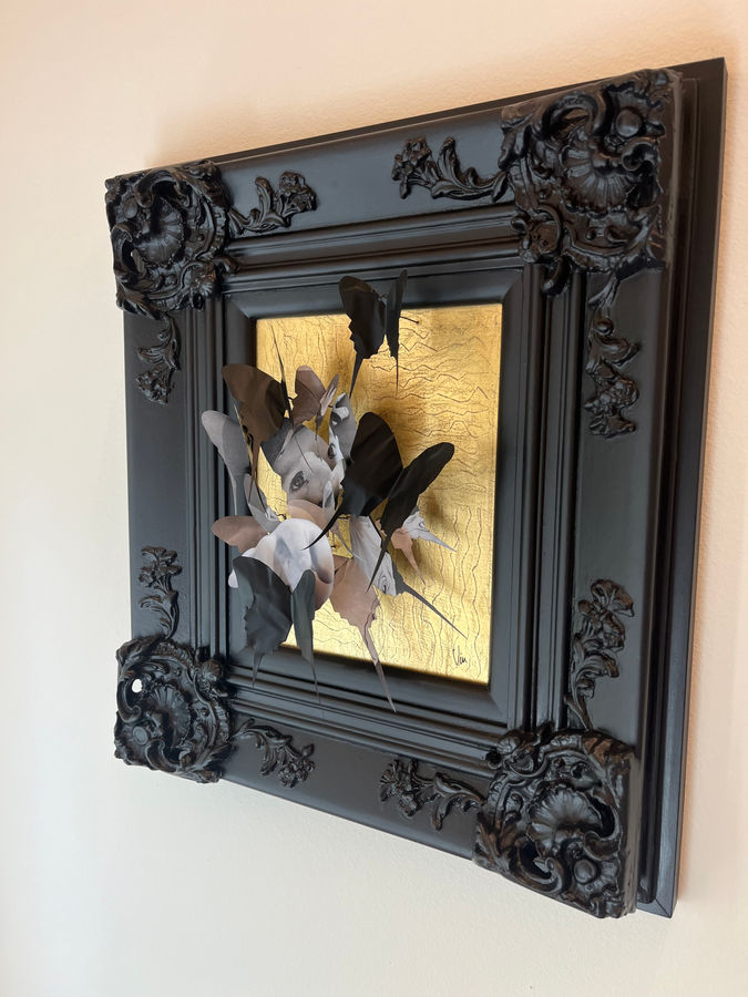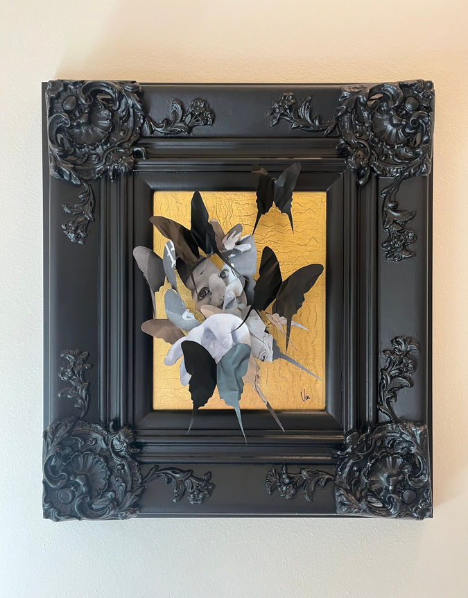 Restored vintage frame, found metal, acrylic, gold leaf, and paper on panel.