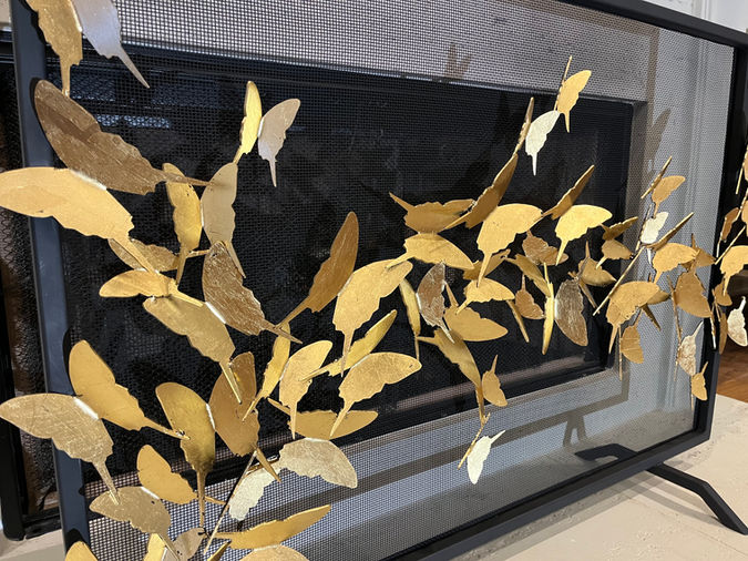 Sculptural Welded Metal and Gold Leaf by the artist (not outsourced to fabricators in a metal shop.) Every screen is unique. Various designs. Signed by Vin. Custom-created for your specific fireplace application. Call for measurement instructions and price quotes.